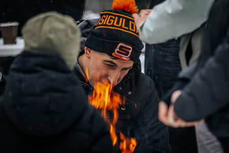 Ligatne, Latvia - January 11, 2026: Man in black beanie warms hands by fire in snowy environment, surrounded by friends enjoying winter activities