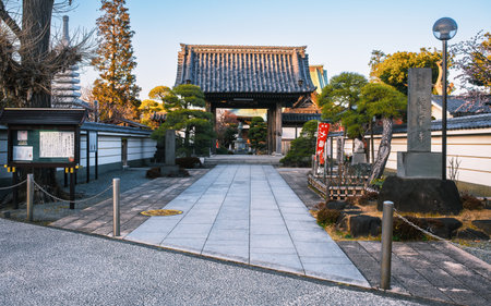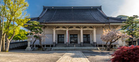 Sendai, Japan 03/06/2019: View of the Rinno-ji Temple at sunset. This is a traditional Shinto temple with religious idols and decorations.