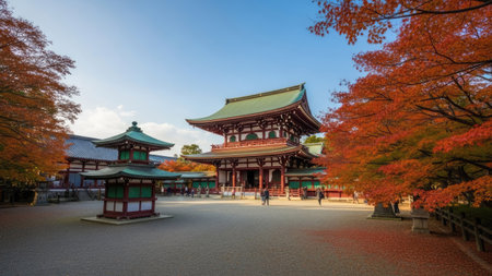 An image showcases a traditional Japanese temple surrounded by vibrant autumn foliage under a clear blue sky. The scene features architectural details with reddish-brown structures and green roofs, set against a backdrop of colorful leaves. This composition might be suitable for travel, cultural, or historical content.