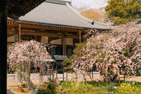 Japanese temple with cherry blossom in spring, Kyoto, Japan.