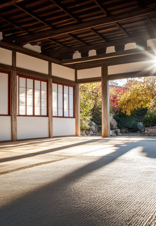 The serene interior features tatami mat flooring with soft sunlight filtering through wooden beams. Outside vibrant autumn foliage complements the peaceful garden space.