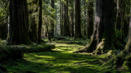 A captivating forest scene featuring tall evergreen trees that allow dappled sunlight to filter through, creating a tranquil atmosphere perfect for nature lovers.