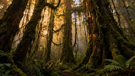 A mystical and serene view of a dense rainforest, shrouded in mist, with ancient trees covered in moss and vibrant green foliage.