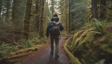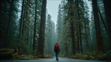 A solitary traveler with a backpack explores a path surrounded by towering ancient trees in a foggy, atmospheric woodland setting, evoking a sense of adventure and wonder.