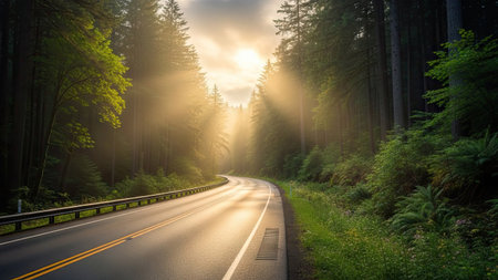 A winding road traverses a vibrant forest, with tall trees lining the route. Golden sunlight streams through the canopy, illuminating the path and creating a dynamic contrast of light and shadow. This image is suitable for various commercial uses, including travel promotions and scenic illustrations.
