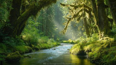 A serene forest scene showcasing a gentle stream surrounded by moss-covered trees, bathed in soft sunlight, creating an inviting natural oasis.