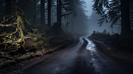Misty road in fir forest. Minimalistic scenery. Generative AI