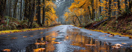 A wet road winds through a dense forest with colorful fall foliage on a cloudy day in the Pacific Northwest.