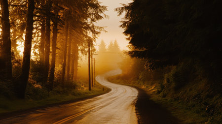 A beautiful winding road meanders through a lush green forest, illuminated by soft dawn light and mist, creating a peaceful and tranquil atmosphere perfect for nature lovers.