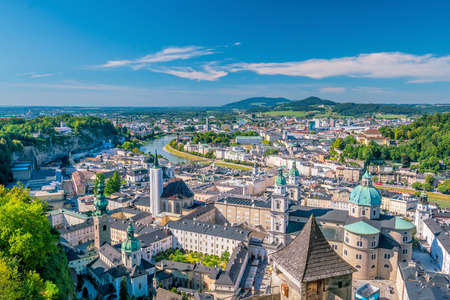 Salzburg city, Austria, view of the Old Town and Festung Hohensalzburg castle on a beautiful sunny day. Salzburg is a birthplace of classical composer Mozart.