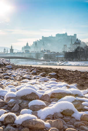Panorama of Salzburg in winter, snow river bank, historical center, river Salzach