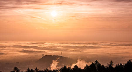 Aerial shoot of Graz city covered if fog on autumn morning during sunraise. View from Plaubutsch hill surrounding city.