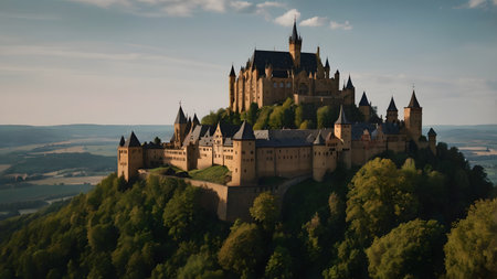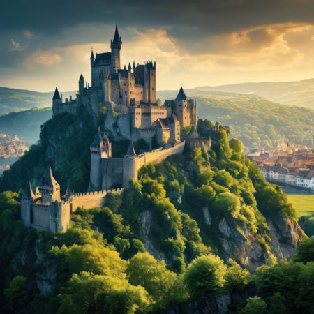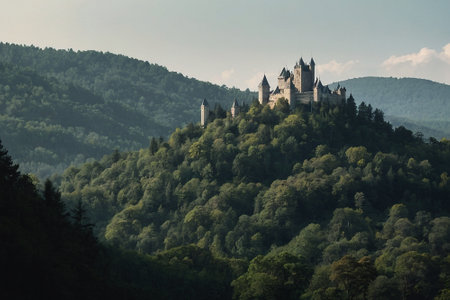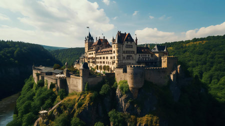 medieval castle perched on a hill, surrounded by a dense forest, with a winding river below. Generative AI