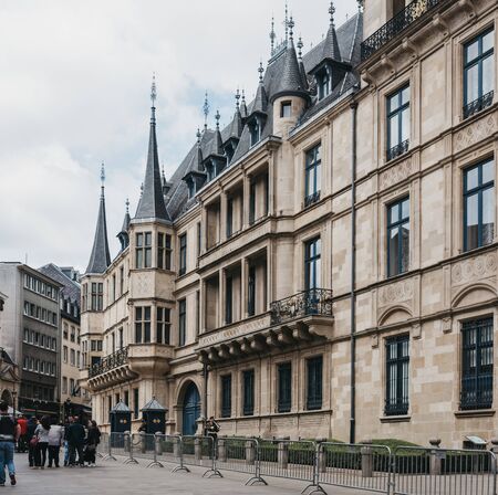 Luxembourg City, Luxembourg - May 19. 2019: People walking past the exterior of Chamber of Deputies, the unicameral national legislature of Luxembourg. Selective focus.