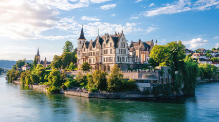 A breathtaking view of a stunning castle perched on a riverbank, embraced by vibrant greenery and a clear blue sky, perfect for travel enthusiasts.