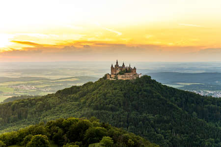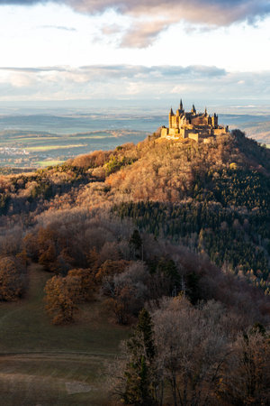 Aerial view of Hohenzollern castle during bright sunset. Germany in the fall