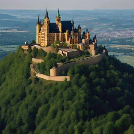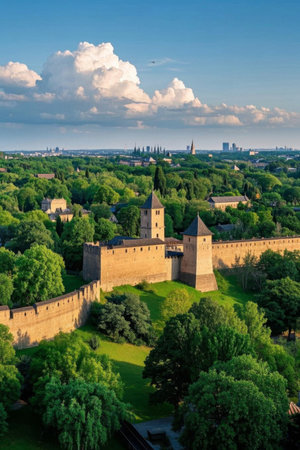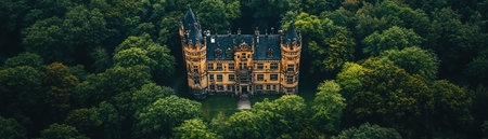 Majestic medieval castle surrounded by lush greenery, captured from above