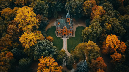 An aerial view showcases a grand brick mansion with a steepled roof, surrounded by a lush green lawn and a dense forest displaying a spectrum of autumn colors.