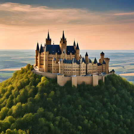 Majestic medieval castle at sunset with dramatic sky overlooking forested landscape.