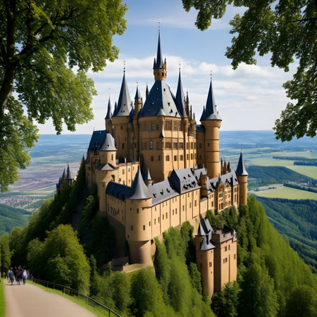 A picturesque view of Sigmaringen Castle, Germany, captured from a lower angle, showcasing a blend of architectural styles and natural elements