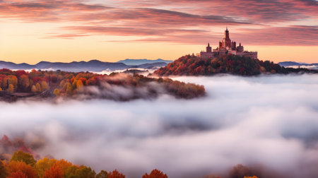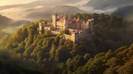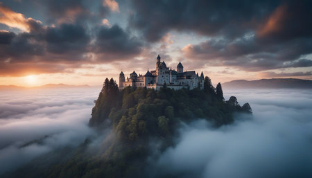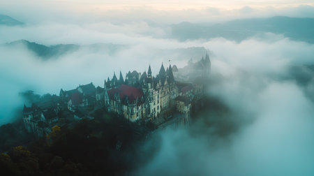 Aerial view of an enchanting castle surrounded by mist and fog. The scene captures nature's beauty at dawn, evoking a magical and serene atmosphere.