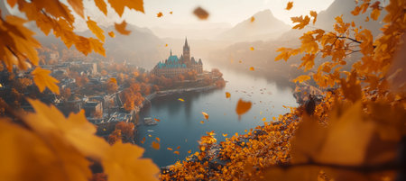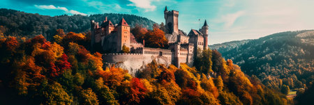 An aerial shot capturing a majestic castle perched on a hilltop surrounded by vibrant autumn foliage, the picturesque scene evokes a sense of wonder and timelessness.