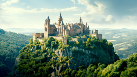An AI generated illustration of a majestic castle atop a mountain surrounded by lush foliage and towering peaks, creating an awe-inspiring sight