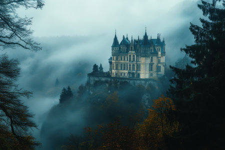 An AI generated illustration of This image features a majestic castle perched atop a misty cliff, with a backdrop of white and grey clouds