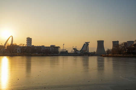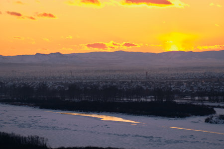 Ulan-Ude, Russia - Jan 31, 2023: Panoramic view from the height of the city and the Selenga River in winter against the background of the sunset sky.