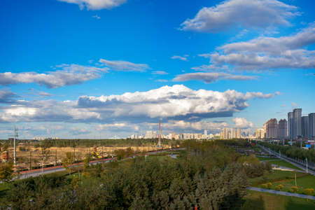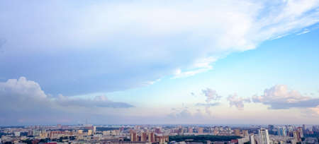 Aerial view of the landscape in a big city with high houses and skyscrapers in the center of Novosibirsk under a beautiful blue sky with clouds on a summer cloudy day.