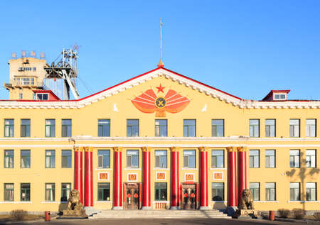 Hegang city,China-15 FEB 2018:the office building of Xingan coal mine,the Chinese on the top of tower is the name of mine ,the Chinese surround of gate means good luck the coming new year