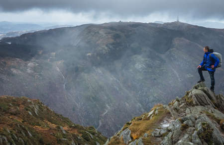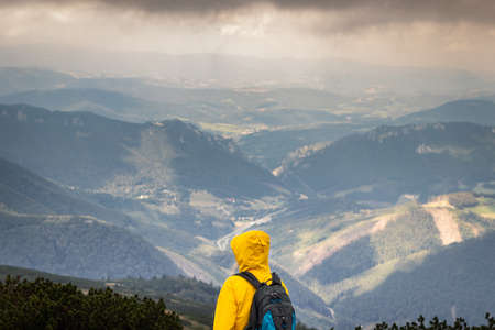 Man in yellow raincoat standing on the edge of a cliff and looking at the foggy valley