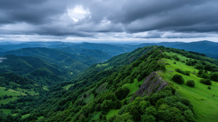Breathtaking view of a lush green mountain landscape under a dramatic cloudy sky, showcasing the serene beauty of nature and tranquil wilderness.