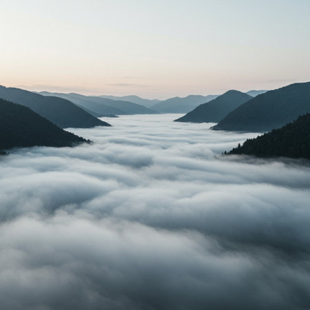Aerial view of a foggy valley in the mountains at sunrise