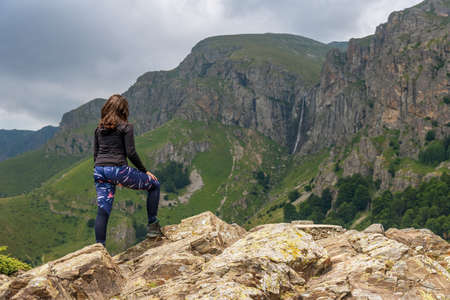 Lone active woman at the edge of the cliff, Central balkan, Bulgaria.