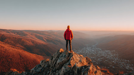 Person clad in vibrant outdoor gear, including a red hooded jacket and orange hat, stands firmly on the sharp, sunlit crest of a high mountain outcrop. They gaze out over an expansive, layered mountain range receding into the distance, with a small settlement nestled in the hazy valley floor below, bathed in the warm glow of either sunrise or sunset.