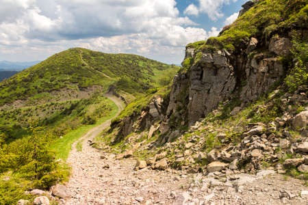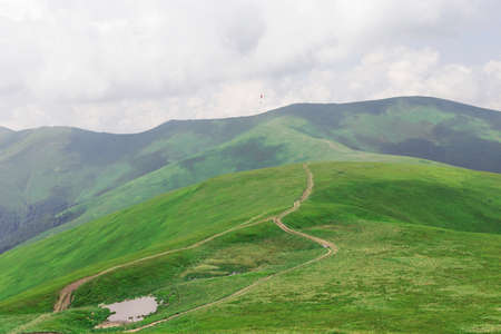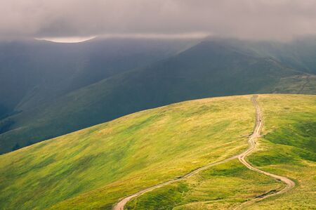 Beautiful mountain landscape with clouds. The road on the green top of Mount Ghimba in the Carpathians.