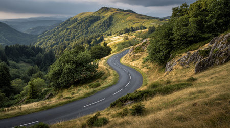 Serpentine road cuts through a green mountain landscape under a cloudy sky