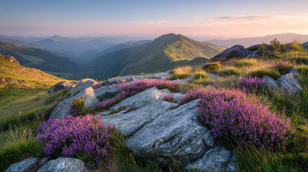 Stunning mountain landscape with vibrant purple flowers and rolling hills at sunrise.