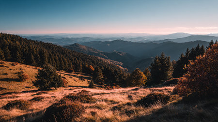 Scenic Mountain Vista at Sunset with Rolling Hills and Evergreen Forest
