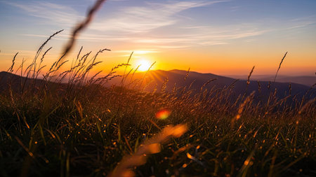 A tranquil mountain scene bathed in the warm light of the setting sun, highlighting a meadow filled with tall grasses and distant peaks.