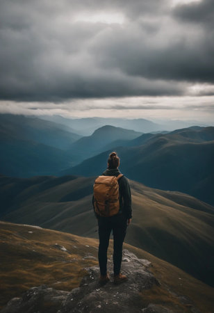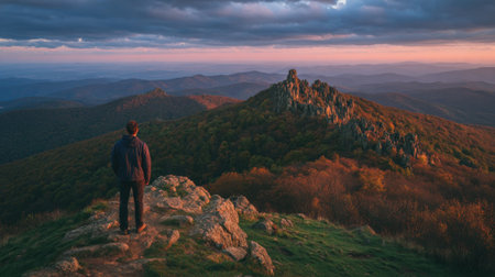 Solitary backpacker stands on rugged peak overlooking vast autumn valley and distant hills under dramatic cloudy sunset sky