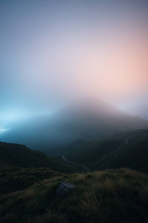 A mountain covered in lush green moss and a hazy, cloudy sky. The mountain is a rocky, steep incline with a small peak at the top. The fog adds a sense of mystery and serenity to the scene