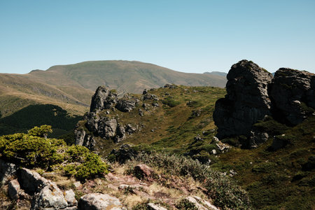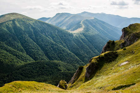 Rocky cliffs and green slopes of Stara Planina with mountain ridges in the distance. Babin Zub mount in summer season. Serbia country