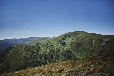 Amazing landscape in summer. Light and afternoon shadow over scenic mountain hills, clear blue sky. mountain valley.