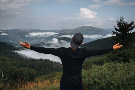 Young man enjoying the view on the top of the mountain. Carpathian mountains, Ukraine