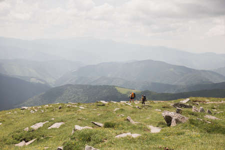 08.07.2021 Ukraine, Carpathians - Group of hikers with backpacks walks in mountains. Freedom, travel concept