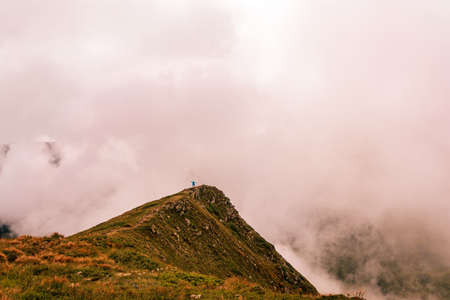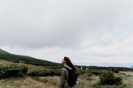 Girl is traveling in the mountains. Foggy day. Hiking and climbing up to the peak of the mountain. Beautiful nature of Ukraine.