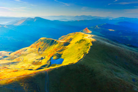 aerial landscape photography. Impressive summer scene with old country road on Menchul ridge. Fantastic morning view from flying drone of Carpathian mountains.