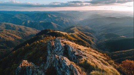 A breathtaking panoramic view of a mountain range during autumn. The foreground shows rocky terrain leading to a sunlit peak with steep cliffs and distant rolling hills.